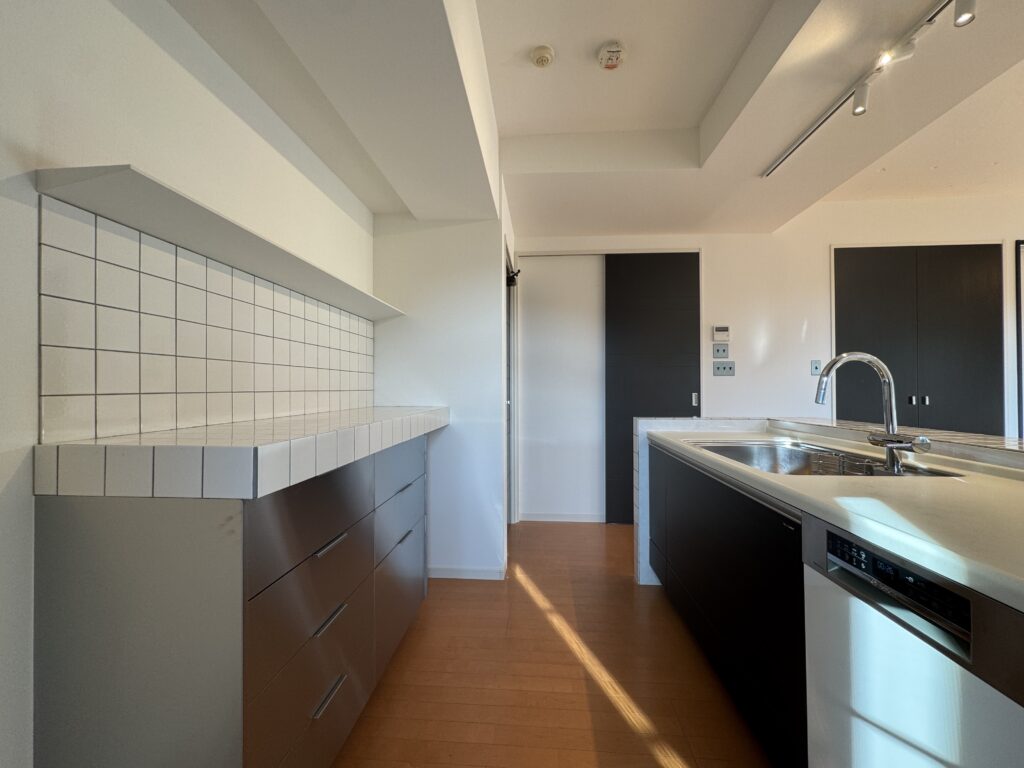 その艶のある質感と調和するように、素材にはタイルやステンレスを組み合わせ、