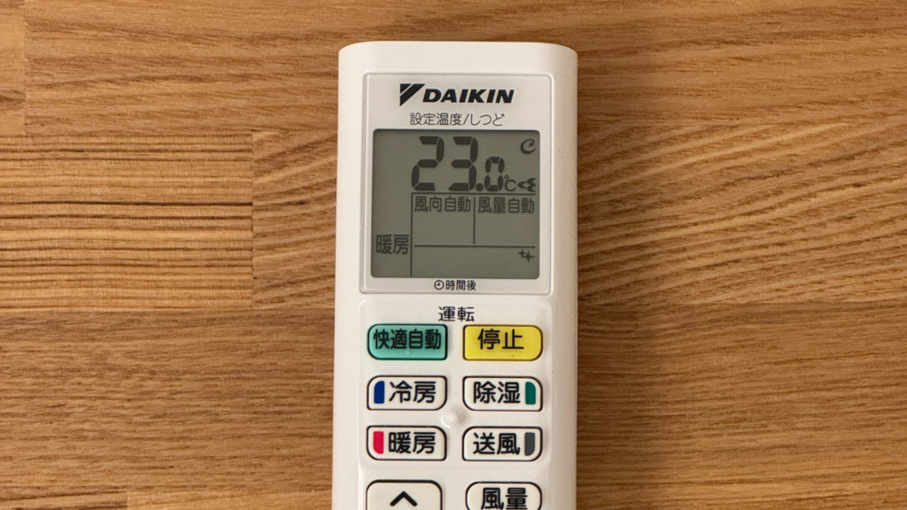 ※実際のエアコンリモコン。23度設定で自動運転です。