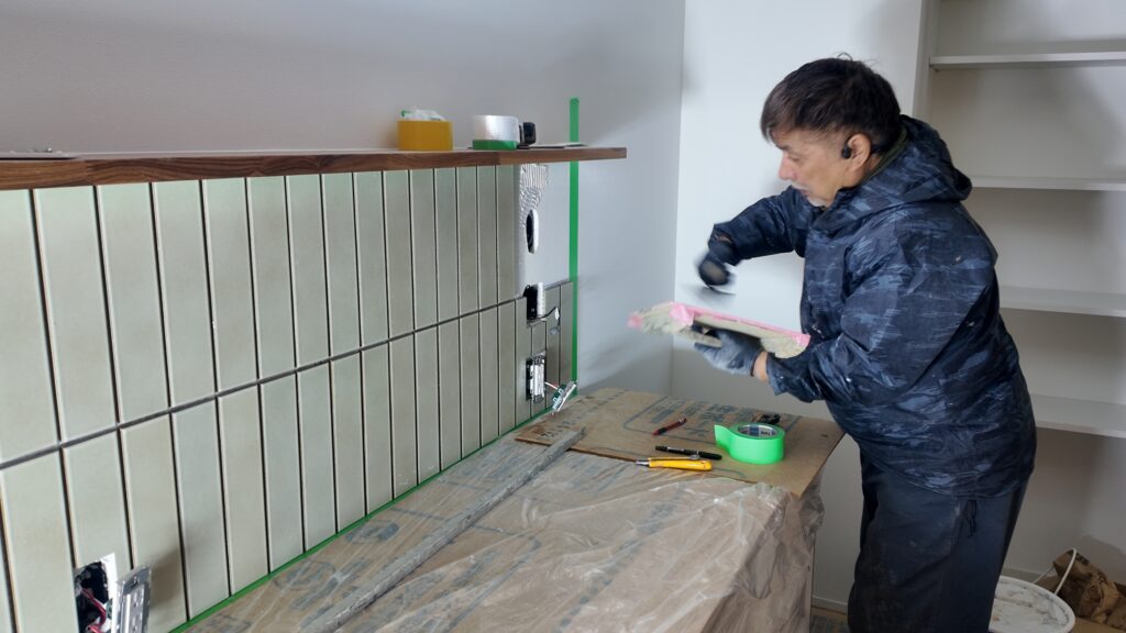 3/2、キッチンタイルの施工日。                                  一枚一枚、位置やバランスを見ながら、丁寧に貼っていく左官職人。                  真っ白な壁に、やわらかさと奥行きを生み出していきます。                      その確かな手仕事で、タイルが少しずつ表情を持ちはじめる瞬間が、とても印象的でした。