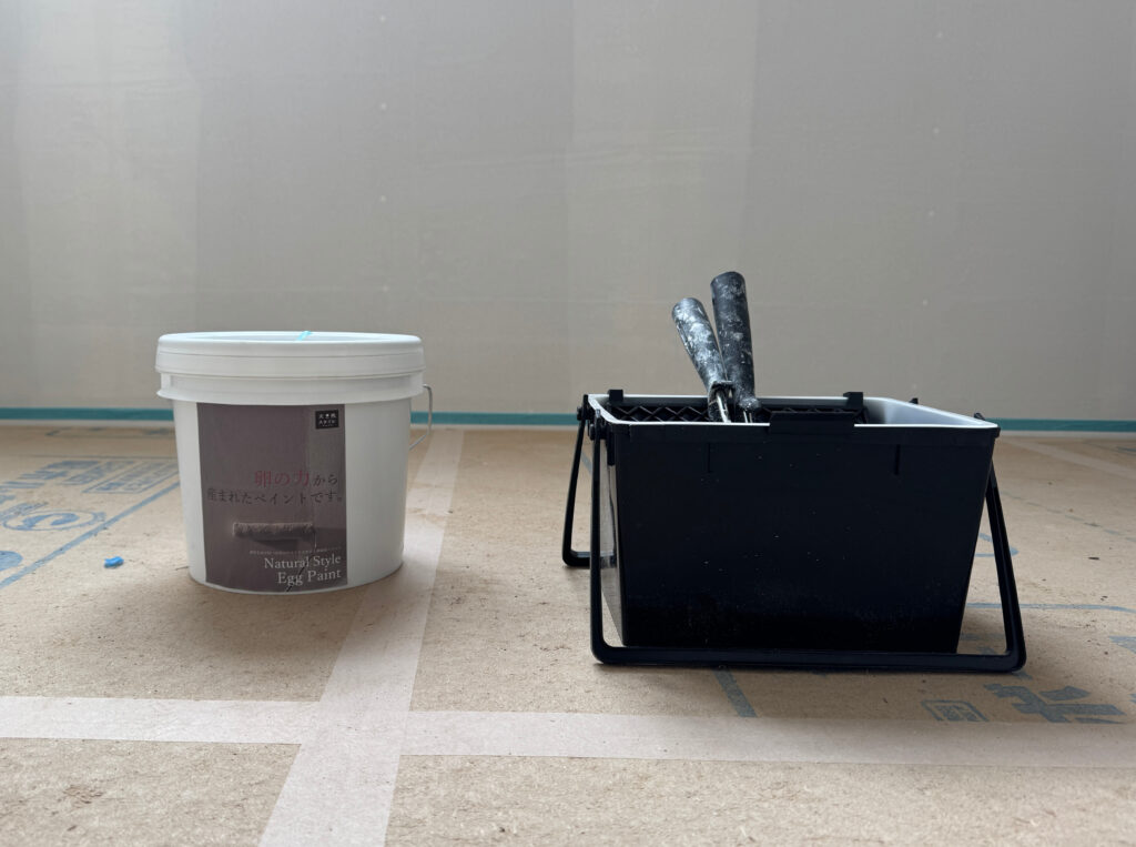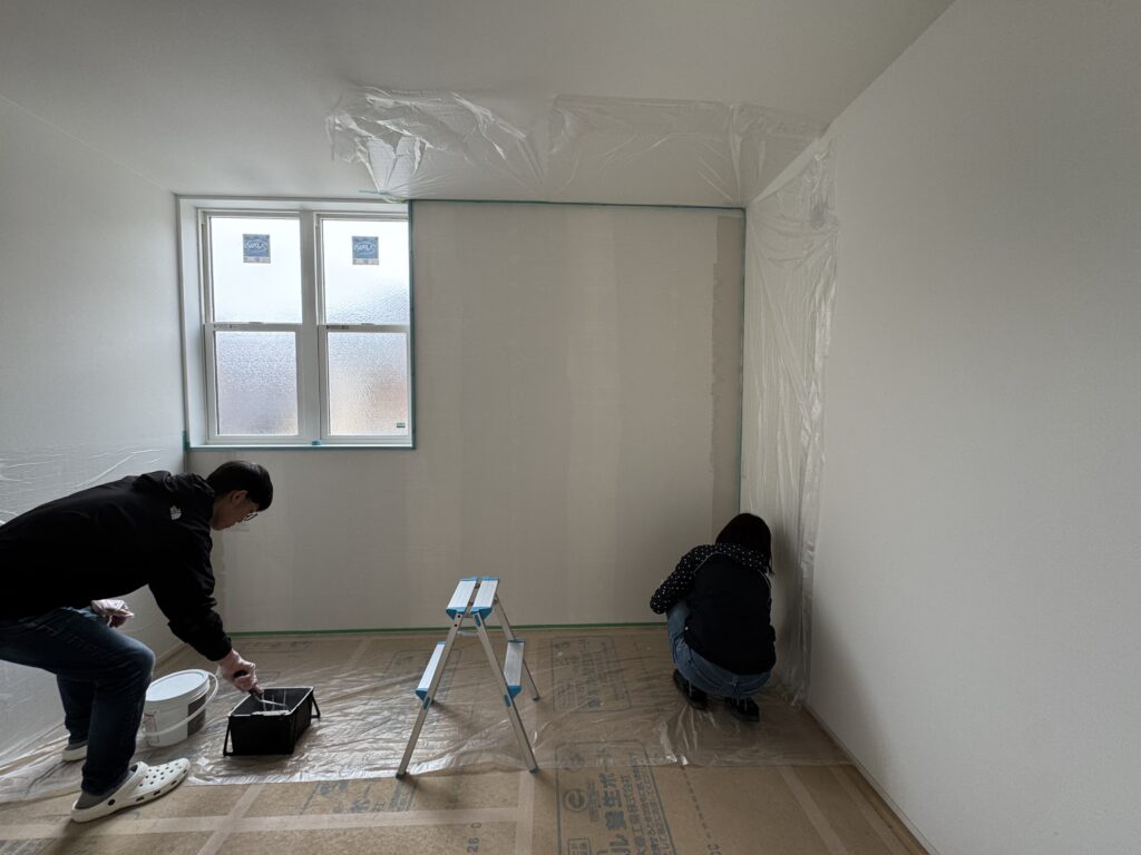 打ち合わせの段階から「自分たちもやってみたいです」と楽しみにしてくださっていたこともあり、今回寝室の一面を一緒に塗ることになりました。